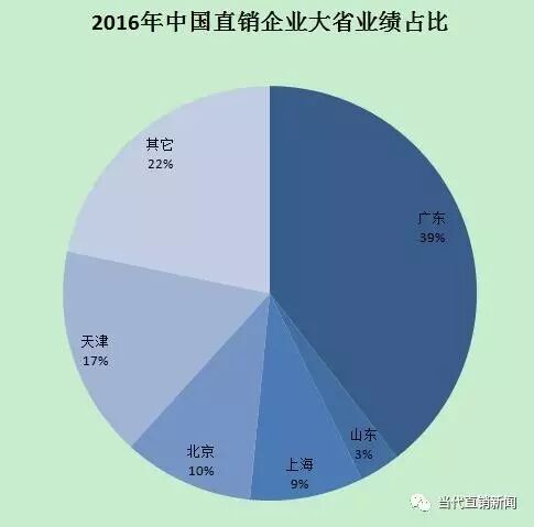 中国直销研究院解读:截止2016年12月31日,中国直销获牌企业80家,分布于22个省。2016年,直销企业居多的前五位直销大省总共贡献了1610.86亿元的业绩。其中,广东省813.33亿元(13家),占比39%;山东省65.53亿元(11家),占比3%;上海182.1亿元(8家),占比9%;北京209.5亿元(7家),占比10%;天津340.4亿元(7家),占比17%。