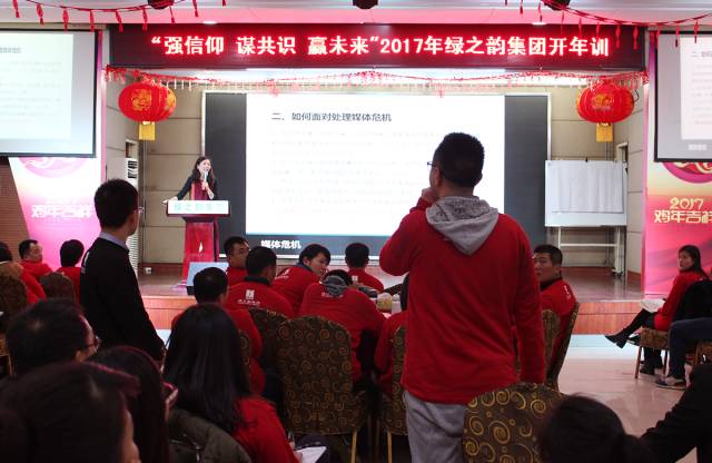 2017年2月4日,鸡年立春节气后第一天,万物发轫,春意渐浓。在这个节日气氛尚未褪尽的初春时节,强信仰、谋共识、赢未来——2017年绿之韵集团全员开年训火热启幕!绿之韵集团董事长胡国安、董事执行总裁劳嘉携公司高管参加培训活动,公司旗下绿韵天成、绿韵汇诚、生态科技、湘潭绿之韵国际大酒店、浏阳绿之韵国际大酒店、湖南绿之韵保健日用品有限公司、湖南绿之韵房地产开发有限公司等全体员工热情高涨,欢欣雀跃地参加了内容丰富、精彩纷呈的新春第一训。